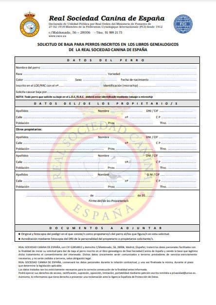 Para solicitar la baja en el LOE o RRC de la Real Sociedad Canina de España, es necesario cumplimentar el impreso destinado a tal fin, aportando la documentación requerida, y pagar el importe que corresponda a esta tramitación, según la tarifa de precios vigente en cada momento.
